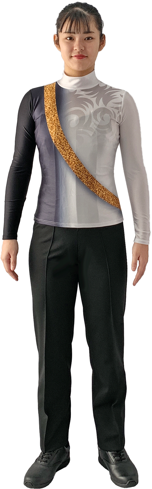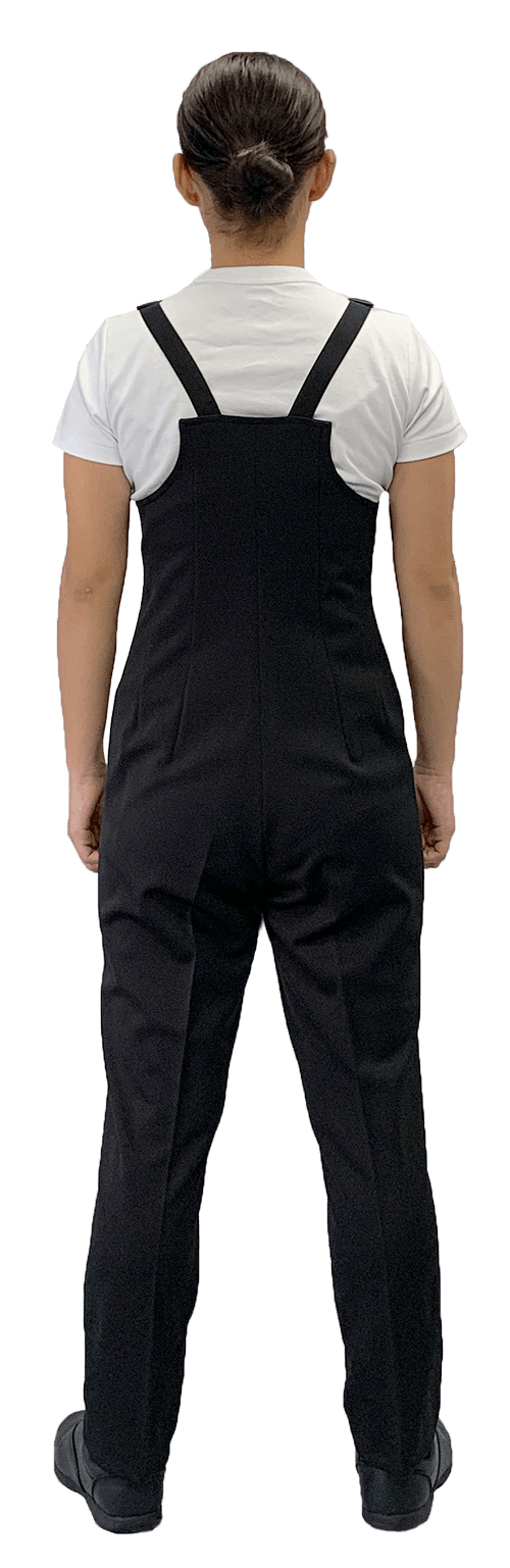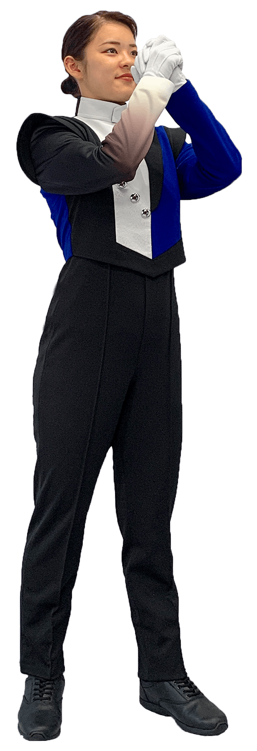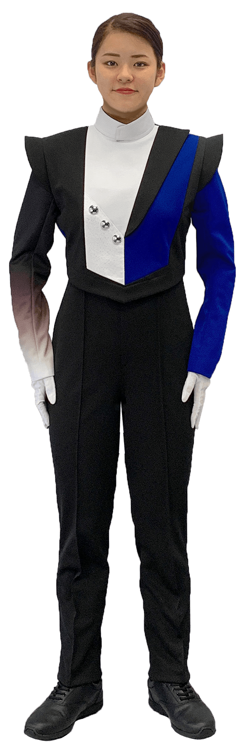胸丈まであるサロペット型マーチングパンツです。基本男女兼用で着用できます。ウインバードマーチングユニフォームのパンツはこちらのタイプで製作をすることが多いです。ハイラインパンツは吊りパンツです。ショート丈のジャケットを着用した際もウエスト部分からインナーが見えることも無く、パンツが下がってこないのでプロポーションが良く見えて統一感が生まれます。トラディショナルなショート丈ジャケットから、ストレッチタイプトップスなども問題無く着用が出来る万能パンツです。裾幅も太すぎずスタイリッシュなシルエットになっており、ニット素材で伸縮性があるので快適に演奏演技をすることができます。黒1色ライン無しの主要サイズは在庫品としてオンラインショップからもご注文頂けます。その他ご要望に応じて色違い、ライン付きなど製作可能です。