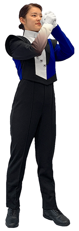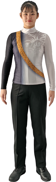 胸丈まであるサロペット型マーチングパンツです。基本男女兼用で着用できます。ウインバードマーチングユニフォームのパンツはこちらのタイプで製作をすることが多いです。ハイラインパンツは吊りパンツです。ショート丈のジャケットを着用した際もウエスト部分からインナーが見えることも無く、パンツが下がってこないのでプロポーションが良く見えて統一感が生まれます。トラディショナルなショート丈ジャケットから、ストレッチタイプトップスなども問題無く着用が出来る万能パンツです。裾幅も太すぎずスタイリッシュなシルエットになっており、ニット素材で伸縮性があるので快適に演奏演技をすることができます。黒1色ライン無しの主要サイズは在庫品としてオンラインショップからもご注文頂けます。その他ご要望に応じて色違い、ライン付きなど製作可能です。